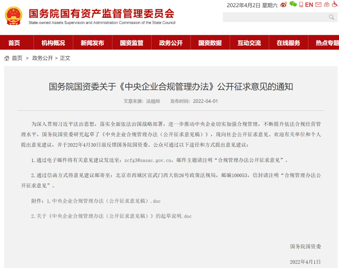 進(jìn)一步推動中央企業(yè)切實(shí)加強(qiáng)合規(guī)管理,不斷提升依法合規(guī)經(jīng)營管理水平,4月1日,國務(wù)院國資委對外發(fā)布《中央企業(yè)合規(guī)管理辦法(公開征求意見稿)》(以下簡稱《辦法》),并向社會公開征求意見。