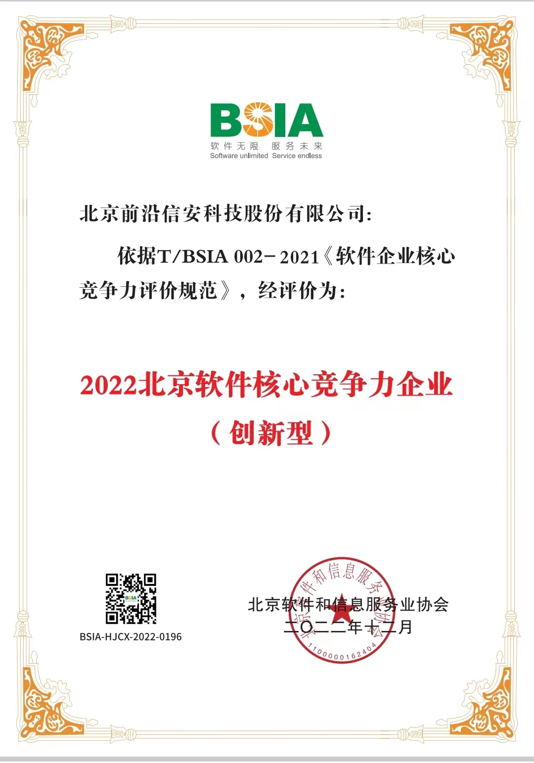2022年12月,依據(jù)T/BSIA 002-2021《軟件企業(yè)核心競爭力評價(jià)規(guī)范》前沿信安取得了2022北京軟件核心競爭力企業(yè)(創(chuàng)新型)認(rèn)定證書